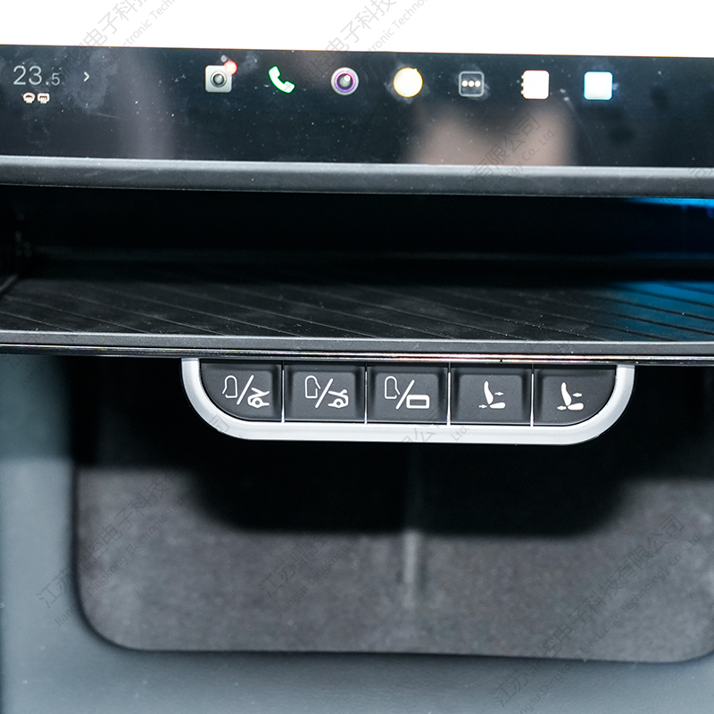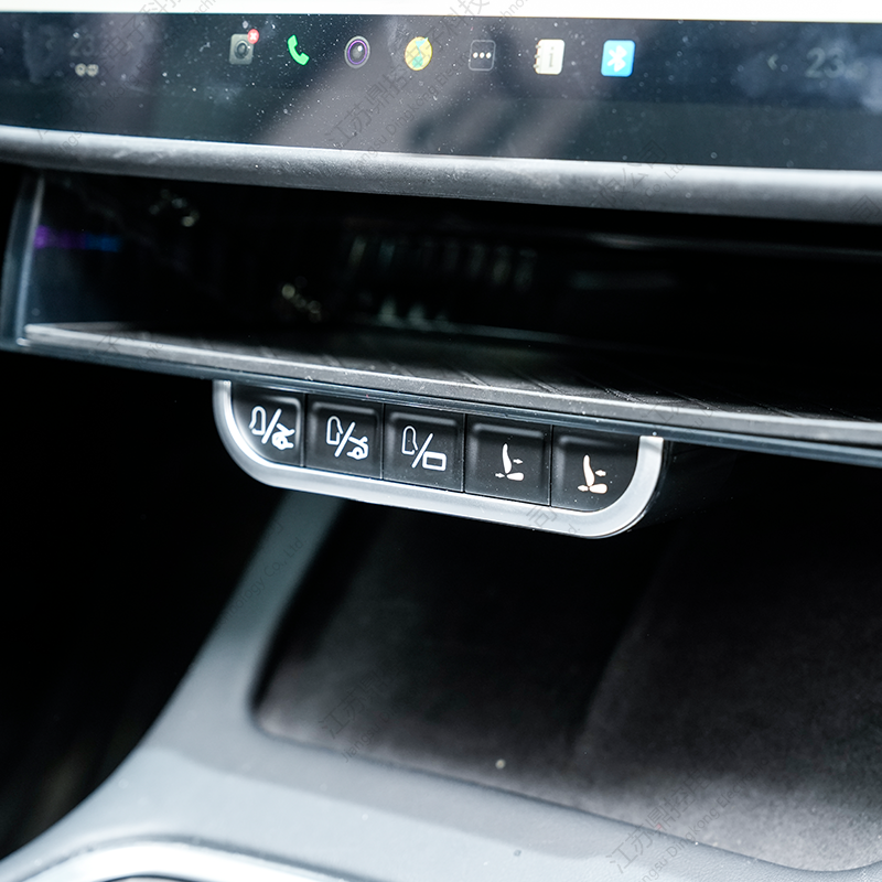 Limang tactile metal buttons ay maayos na nakaayos sa ibaba ng tray, na nagbibigay ng intuitive na access sa mahahalagang function ng sasakyan. Ang bawat pindutan ay tumutugon sa isang malutong na haptic na pag-click, na nagbibigay sa mga user ng isang solidong pakiramdam ng kontrol. Kasama sa mga pag-andar ang pagbubukas at pagsasara ng mga pintuan sa harap, sa harap at likurang trunks, at pagkontrol sa takip ng port ng charge — lahat ay agad na naa-access sa iyong mga kamay.